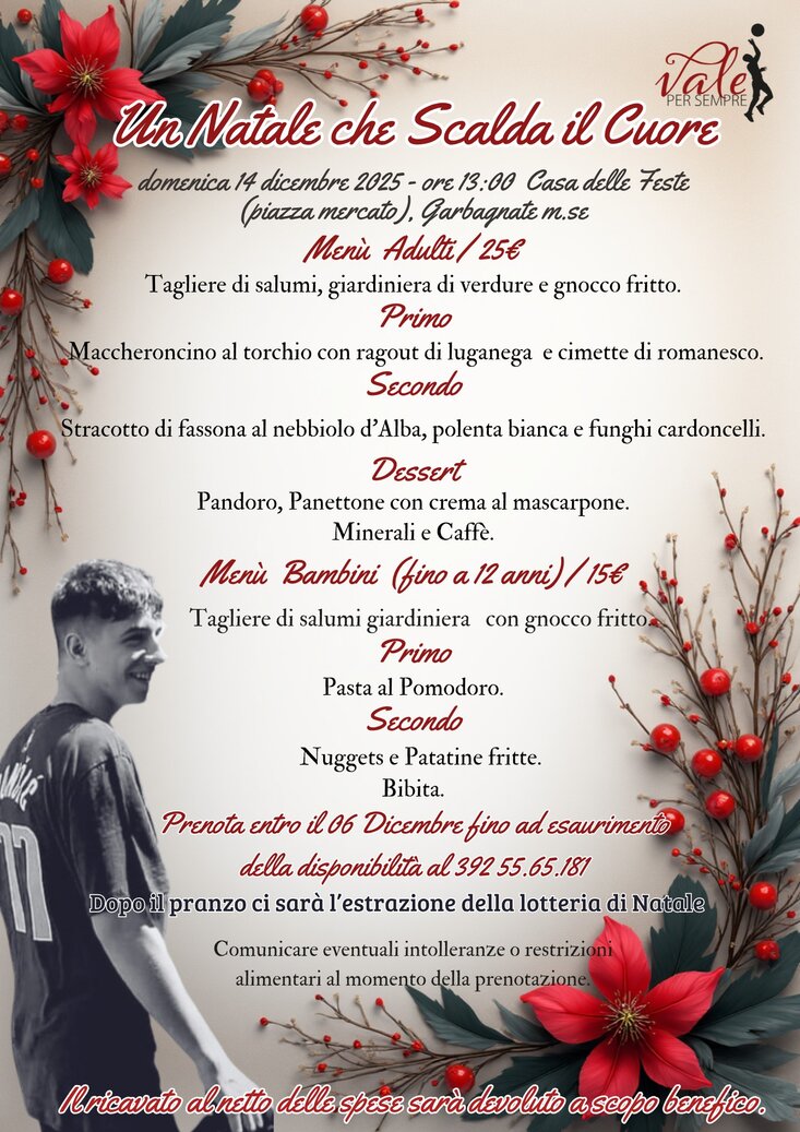 La famiglia dell'Associazione Vale per Sempre ha il piacere di trascorrere con voi il pranzo di Natale, un momento speciale dedicato alla convivialità e alla condivisione.